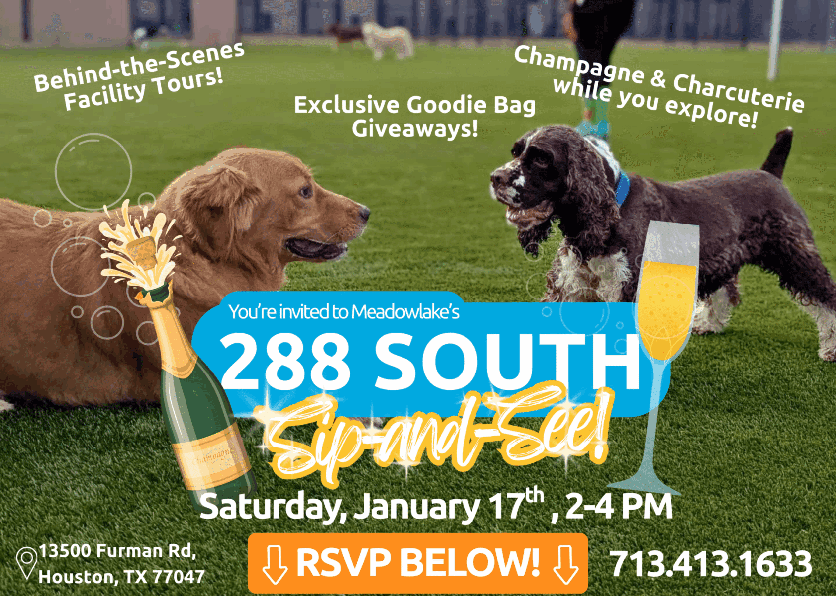 Enjoy champagne and charcuterie while you explore, take part in fun giveaways, and leave with a special goodie bag as our thank you for stopping by. Whether you’re a longtime pet parent or just discovering Meadowlake, this is the perfect chance to experience the care, attention, and personal touch that define our resort.
